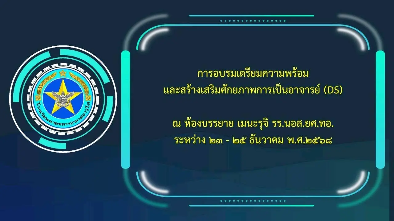 นาวาอากาศเอก ณฐพงศ์ ตาละลักษมณ์ ผู้อำนวยการโรงเรียนนายทหารอากาศอาวุโส กรมยุทธศึกษาทหารอากาศ เป็นประธานในการอบรมเตรียมความพร้อมและเสริมสร้างศักยภาพการเป็นอาจารย์ (DS) ประจำปี ๒๕๖๙ มีวัตถุประสงค์เพื่อเพิ่มพูนความรู้ ทักษะ สมรรถนะของอาจารย์โรงเรียนนายทหารอากาศอาวุโส กรมยุทธศึกษาทหารอากาศ รวมถึงการเตรียมความพร้อมนายทหารสัญญาบัตรที่เข้ารับตำแหน่งใหม่ในการปฏิบัติหน้าที่อาจารย์ของโรงเรียนนายทหารอากาศอาวุโส กรมยุทธศึกษาทหารอากาศ ให้มีศักยภาพเพื่อทำหน้าที่ได้อย่างมีประสิทธิภาพและเป็นมาตรฐานเดียวกัน ระหว่างวันที่ ๒๓-๒๕ ธันวาคม ๒๕๖๘ ณ ห้องบรรยายเมนะรุจิ โรงเรียนนายทหารอากาศอาวุโส กรมยุทธศึกษาทหารอากาศ