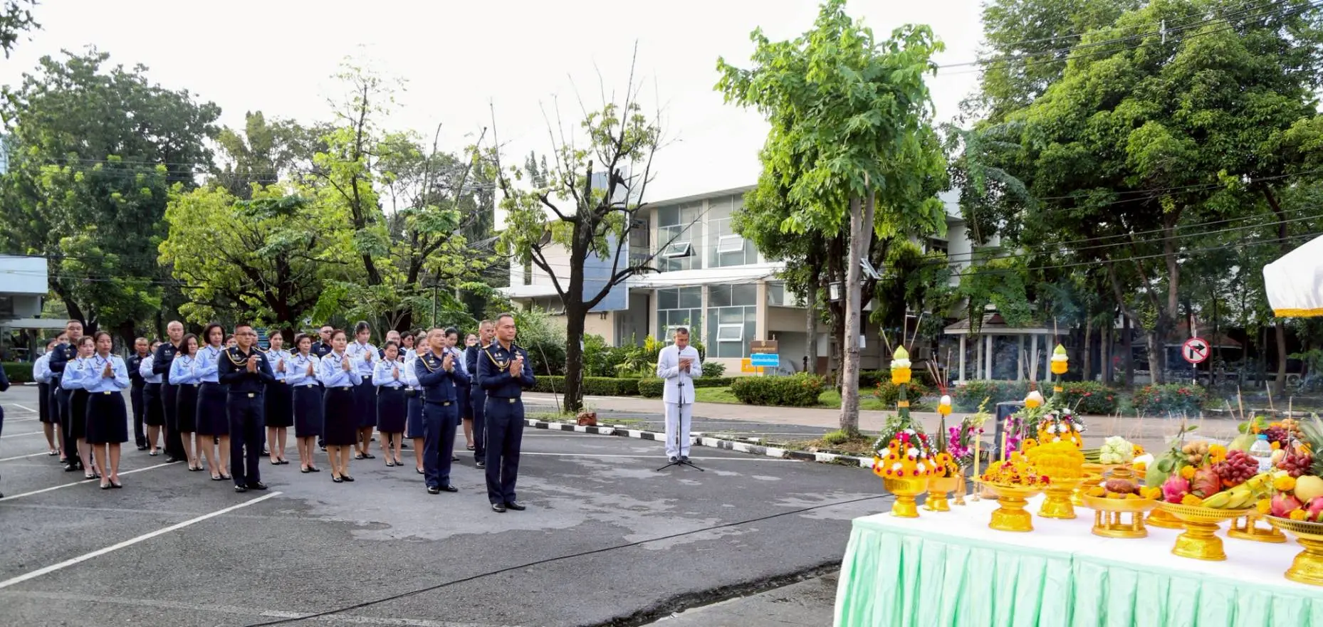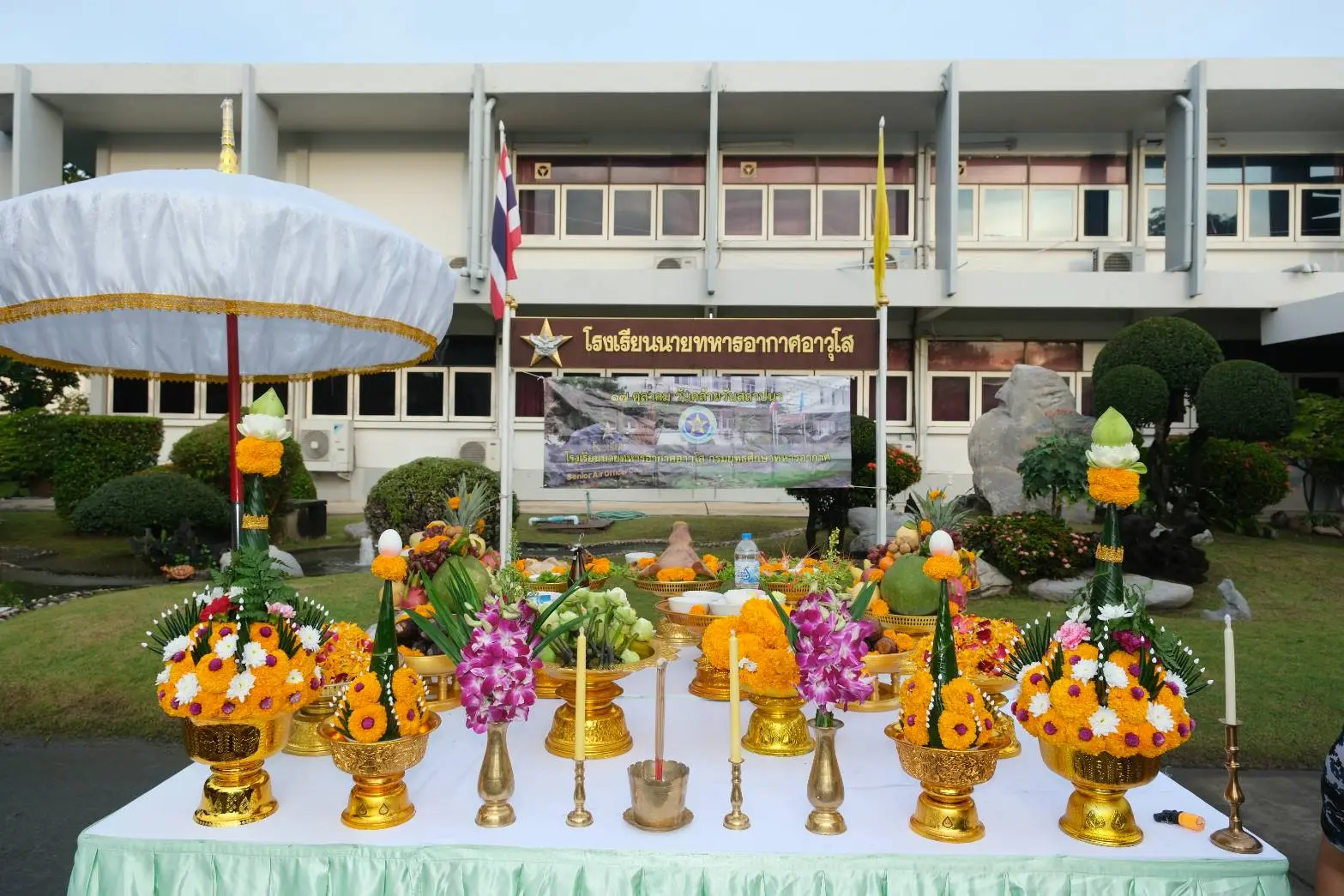 เวลา ๐๗๐๙ พิธีบวงสรวงทวยเทพเทวา และถวายสักการะพระบิดากองทัพอากาศ ณ โรงเรียนนายทหารอากาศอาวุโส กรมยุทธศึกษาทหารอากาศ